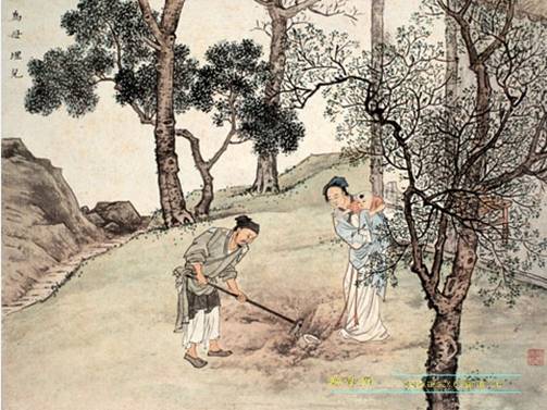 郭巨,晉代隆慮(今河南林縣)人,一說河內(nèi)溫縣(今河南溫縣西南)人,原本家道殷實(shí)。父親死后,他把家產(chǎn)分作兩份,給了兩個(gè)弟弟,自己獨(dú)取母親供養(yǎng),對(duì)母極孝。后家境逐漸貧困,妻子生一男孩,郭巨擔(dān)心,養(yǎng)這個(gè)孩子,必然影響供養(yǎng)母親,遂和妻子商議:“兒子可以再有,母親死了不能復(fù)活,不如埋掉兒子,節(jié)省些糧食供養(yǎng)母親?!碑?dāng)他們挖坑時(shí),在地下二尺處忽見一壇黃金,上書“天賜郭巨,官不得取,民不得奪”。夫妻得到黃金,回家孝敬母親,并得以兼養(yǎng)孩子。