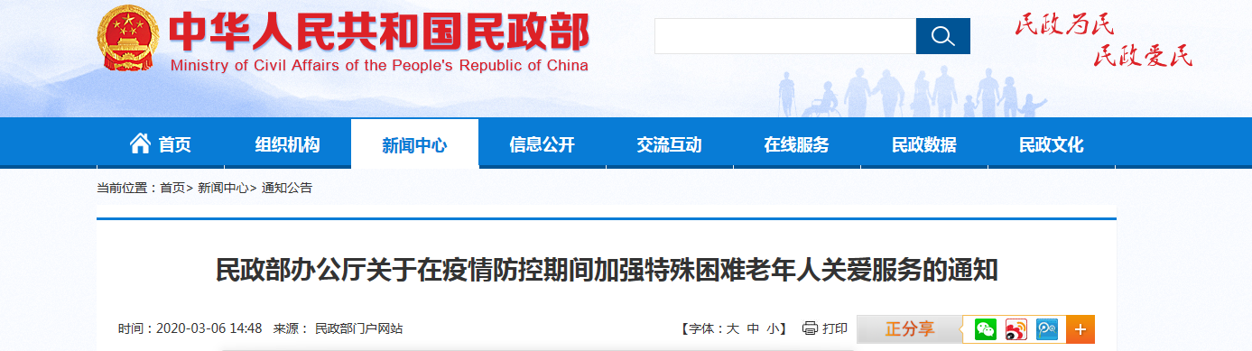 3月6日,民政部辦公廳印發(fā)《關(guān)于在疫情防控期間加強特殊困難老年人關(guān)愛服務(wù)的通知》(民辦發(fā)〔2020〕7號,以下簡稱《通知》),就新冠肺炎疫情防控期間加強對因疫情在家的孤寡老人等特殊困難老年人關(guān)愛服務(wù)作出部署。