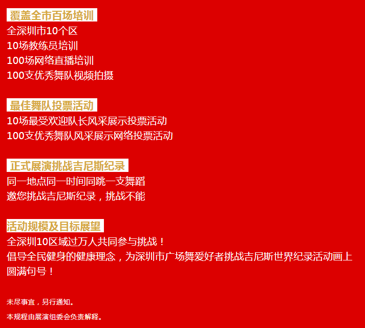 為確?;顒?dòng)如期順利舉辦并具影響力,萬(wàn)人展演大賽負(fù)責(zé)人李麗女士稱,在新聞發(fā)布會(huì)啟動(dòng)儀式過(guò)后,挑戰(zhàn)吉尼斯記錄展演日之前,這場(chǎng)將為期半年的萬(wàn)人展演活動(dòng),將通過(guò)培訓(xùn) — 投票 — 挑戰(zhàn),由2020年6月15日起覆蓋全深圳10個(gè)區(qū)域,貫穿700+個(gè)社區(qū),過(guò)萬(wàn)人共同參與,更會(huì)在過(guò)程中舉行逾百場(chǎng)的公益培訓(xùn)、最佳展示投票、進(jìn)行優(yōu)秀舞蹈視頻拍攝等系列相關(guān)活動(dòng),直至2020年12月12日,正式迎來(lái)萬(wàn)眾矚目 同一時(shí)間,同一地點(diǎn) 完成萬(wàn)人挑戰(zhàn)吉尼斯紀(jì)錄展演活動(dòng)!
